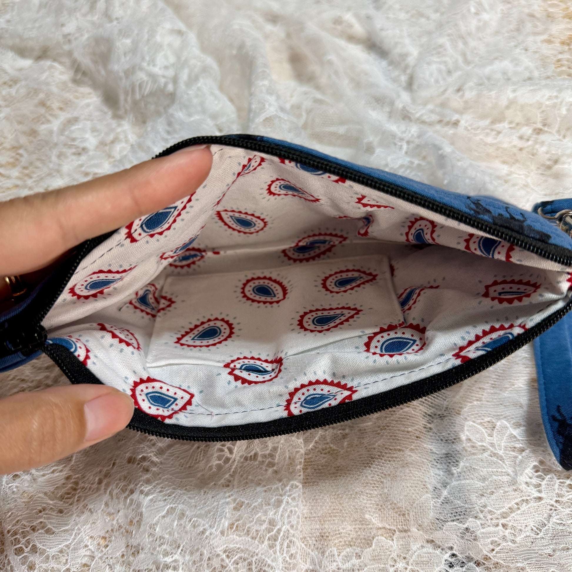 Materials: Cotton exterior Fabric, Cotton Lining, polyester batting, zipper, metal lobster clasp & D-ring