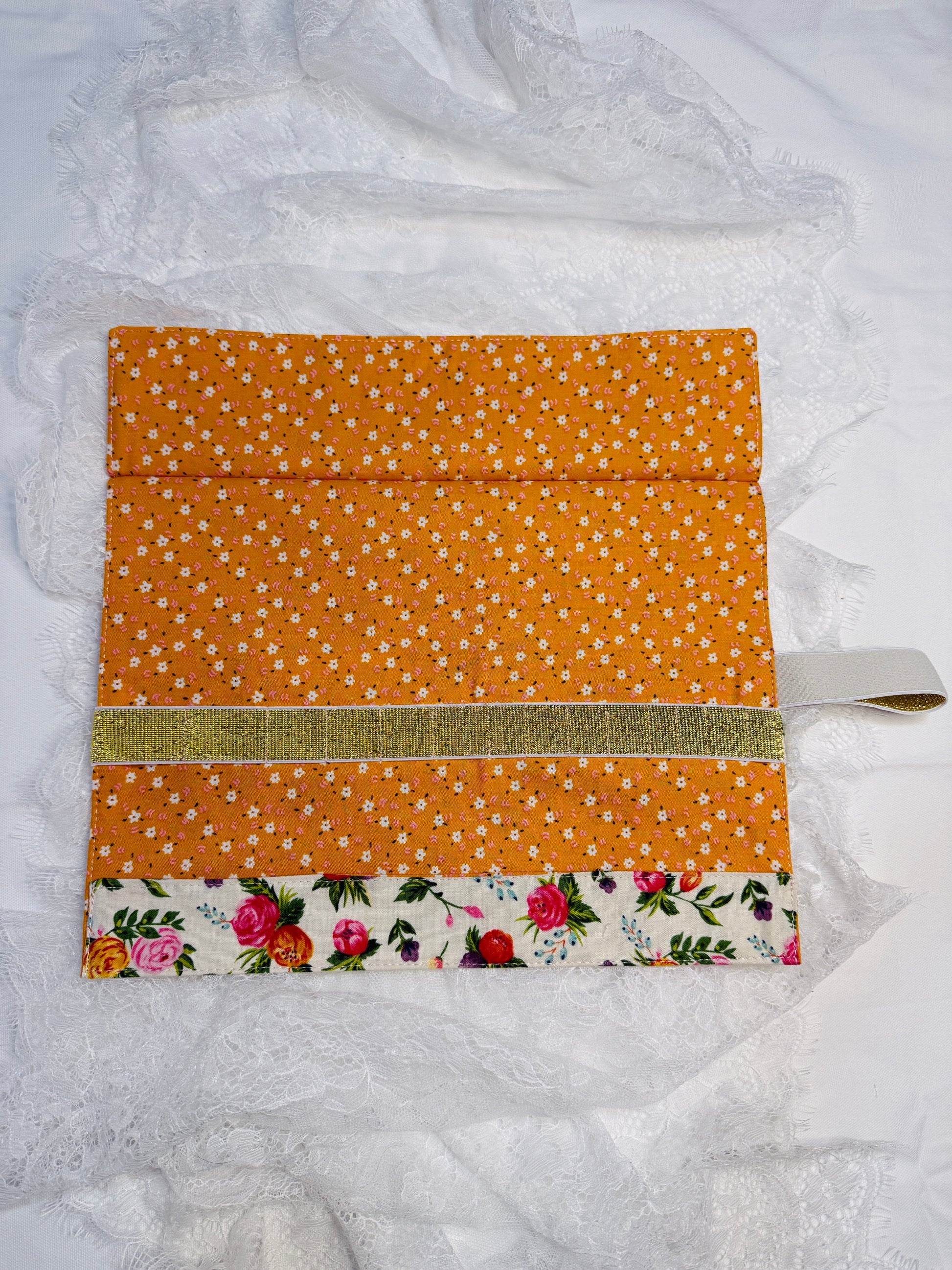 Roll with style! This handmade delightful brush organizer wraps your makeup essentials in this fun fabric—both inside and out. Metallic elastic straps snugly cradle up to 14 brushes of various sizes, from tiny detail brushes to full-sized fluffy ones, keeping everything exactly where you left it. Toss it in the wash when needed, let it air dry, and you're good to go. Compact enough for weekends away or daily touch-ups, this clever roll transforms brush chaos into organized bliss wherever your beauty routine takes you. This one-of-a-kind makeup brush roll is waiting to come home with you!
