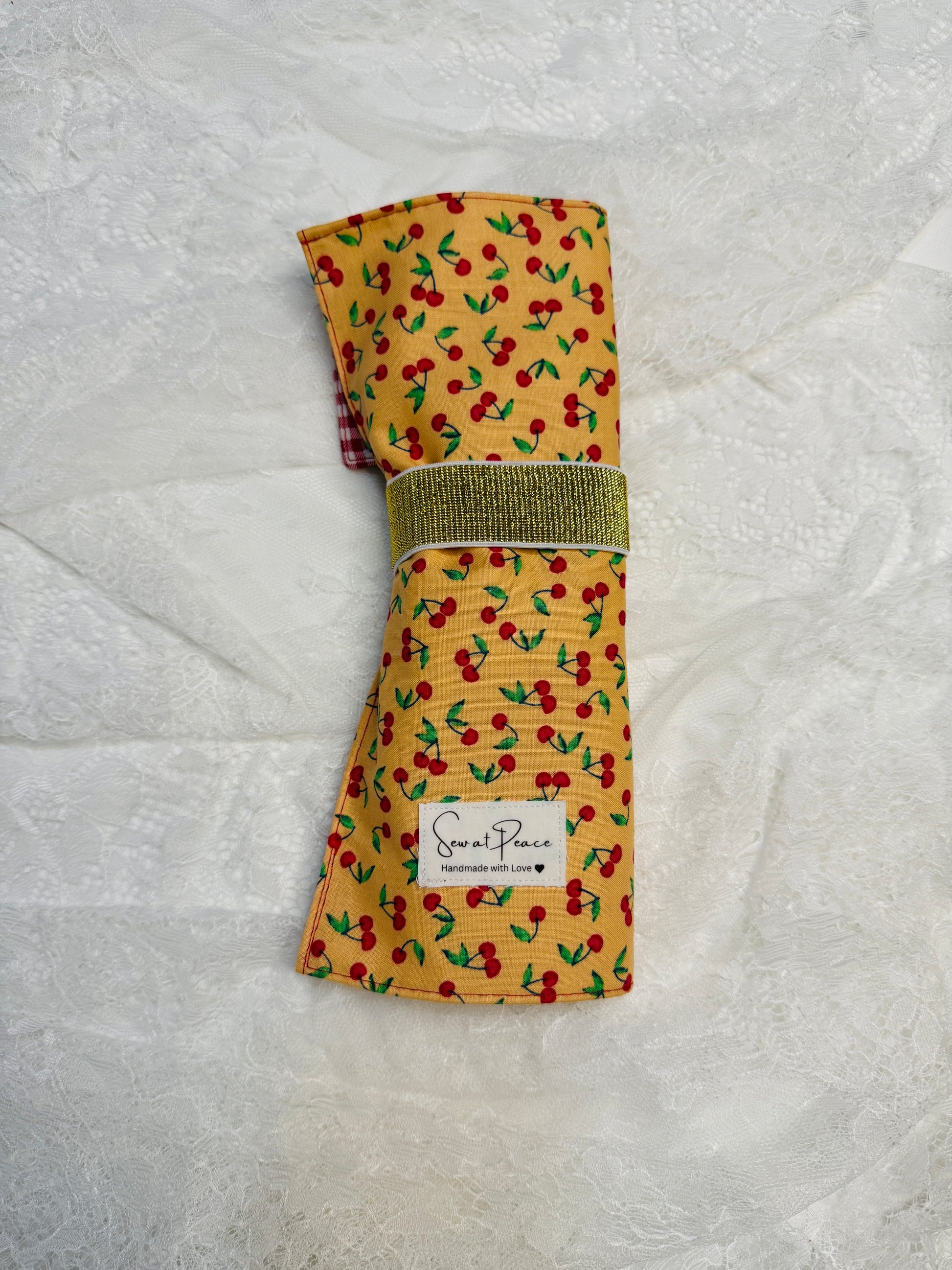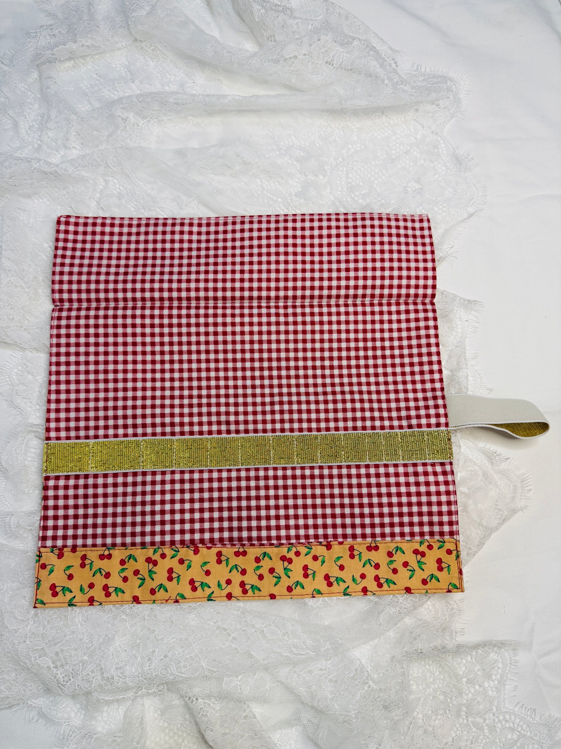 Roll with style! This handmade delightful brush organizer wraps your makeup essentials in this fun fabric—both inside and out. Metallic elastic straps snugly cradle up to 14 brushes of various sizes, from tiny detail brushes to full-sized fluffy ones, keeping everything exactly where you left it. Toss it in the wash when needed, let it air dry, and you're good to go. Compact enough for weekends away or daily touch-ups, this clever roll transforms brush chaos into organized bliss wherever your beauty routine takes you. This one-of-a-kind makeup brush roll is waiting to come home with you!