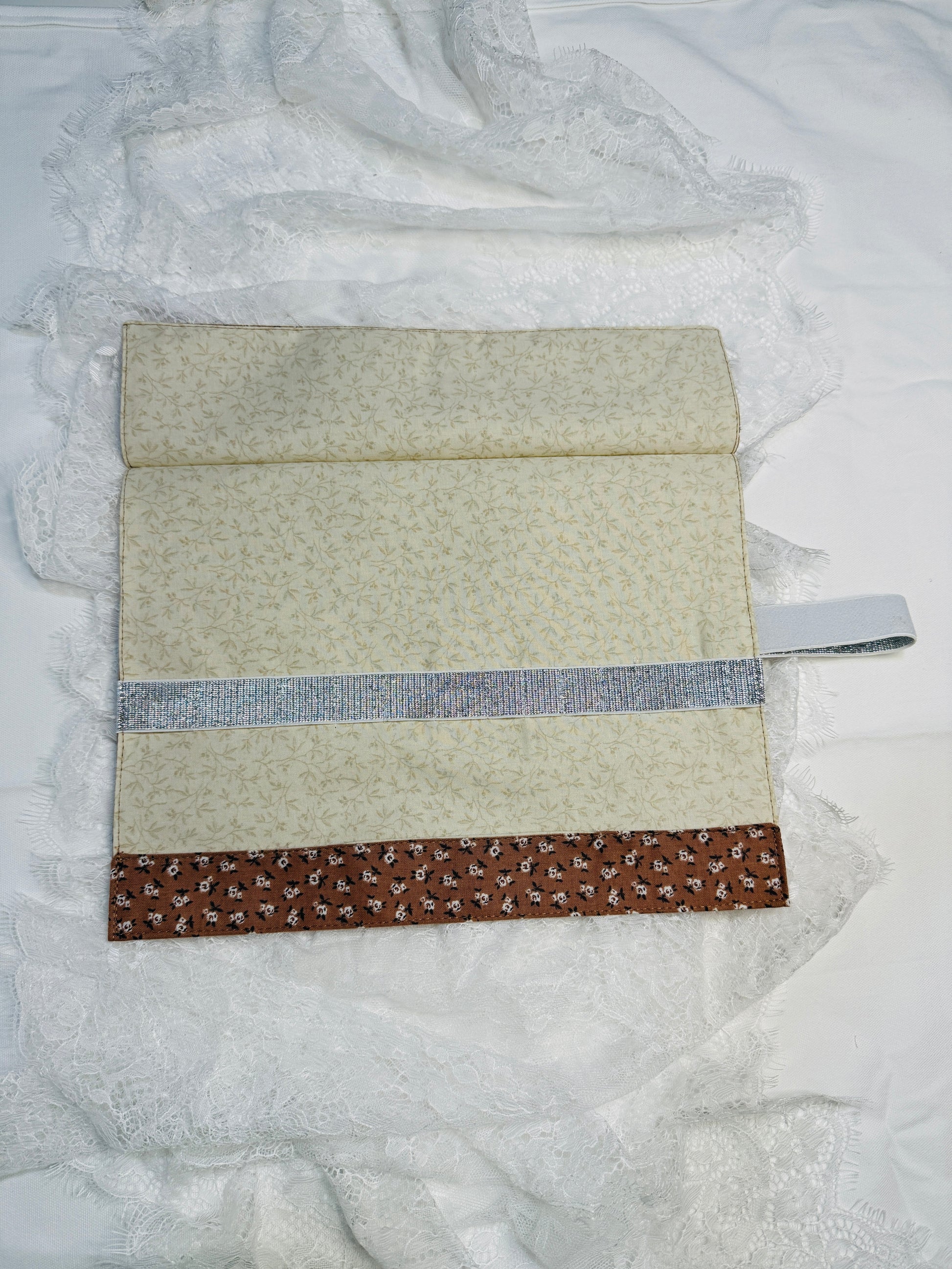 Roll with style! This handmade delightful brush organizer wraps your makeup essentials in this fun fabric—both inside and out. Metallic elastic straps snugly cradle up to 14 brushes of various sizes, from tiny detail brushes to full-sized fluffy ones, keeping everything exactly where you left it. Toss it in the wash when needed, let it air dry, and you're good to go. Compact enough for weekends away or daily touch-ups, this clever roll transforms brush chaos into organized bliss wherever your beauty routine takes you. This one-of-a-kind makeup brush roll is waiting to come home with you!