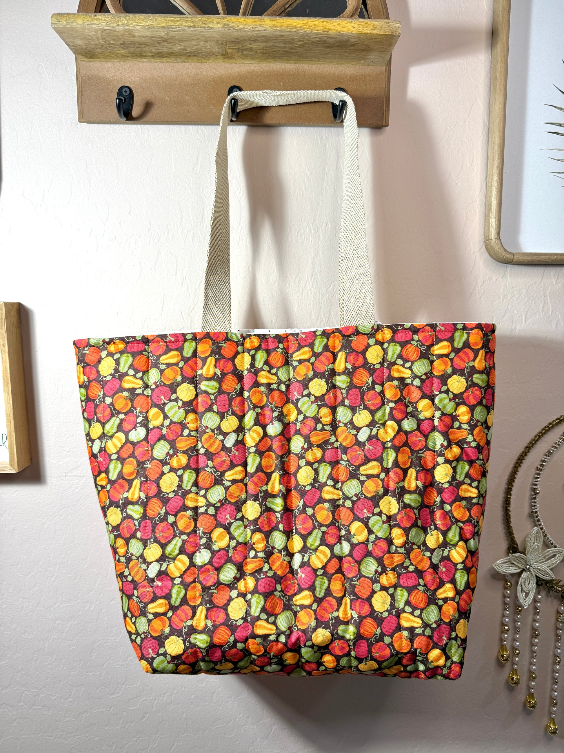 Carry your essentials in style with this handmade oversized tote featuring vibrant pumpkins and gourds that celebrate the season. The sturdy gold metallic straps make it easy to sling over your shoulder, while the secure metal snap closure keeps your belongings safe. Inside, you'll discover a cheerful white polka dot print lining and two large convenient pockets perfect for organizing everything from your phone to your keys. Whether you're heading to the farmers market or a weekend getaway, this playful tote brings a touch of autumn charm to every adventure. Truly one of a kind!