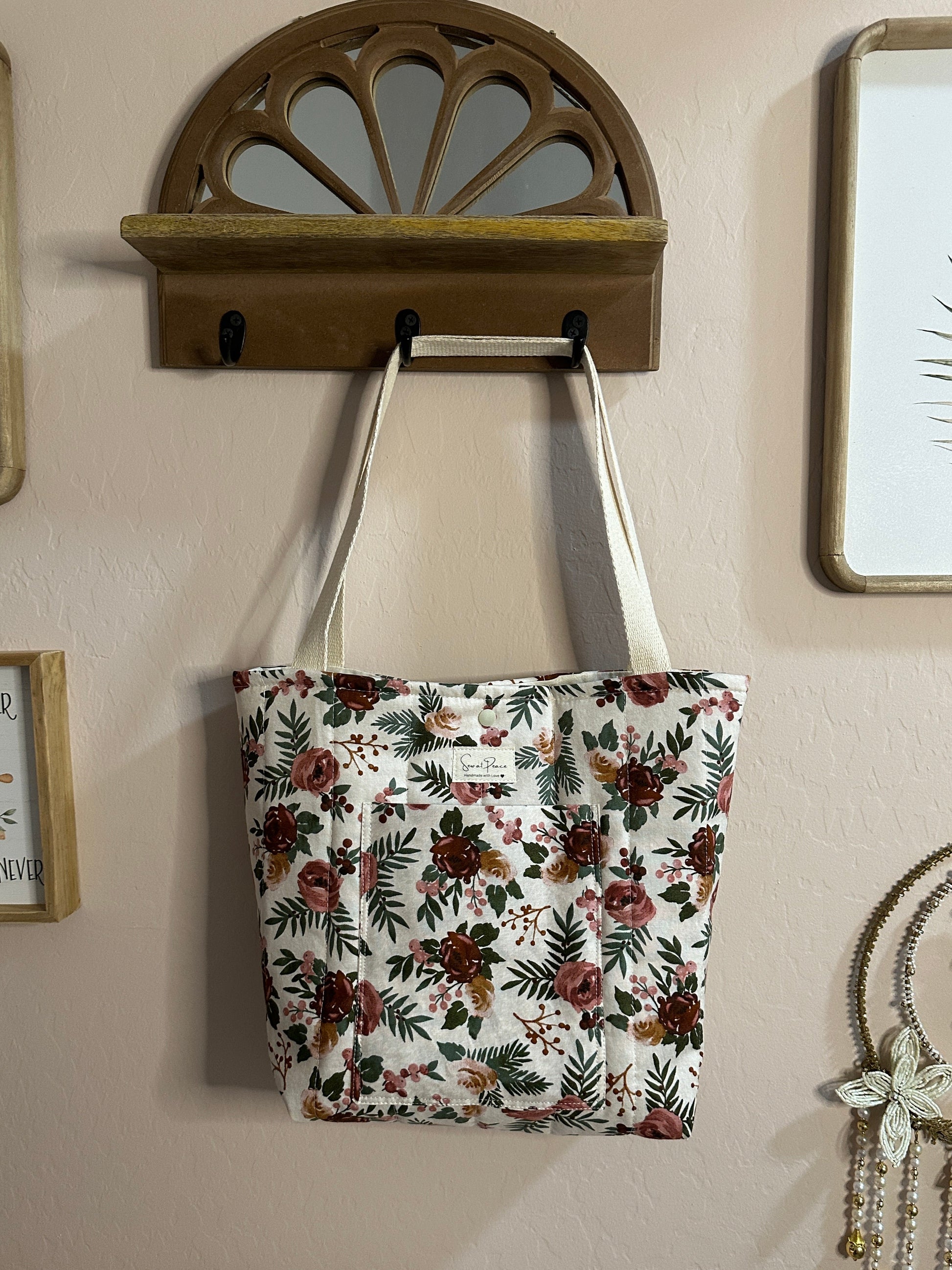 This handmade Floral Tote Bag is a must-have for any fashion-forward individual. Featuring an inner and outer pocket and plastic snap button closure. Made with quilted cotton, it boasts a beautiful floral print. With its timeless print and sturdy construction, this bag is both stylish and durable. Choose between plain or fabric covered cotton webbing straps for the perfect finishing touch.