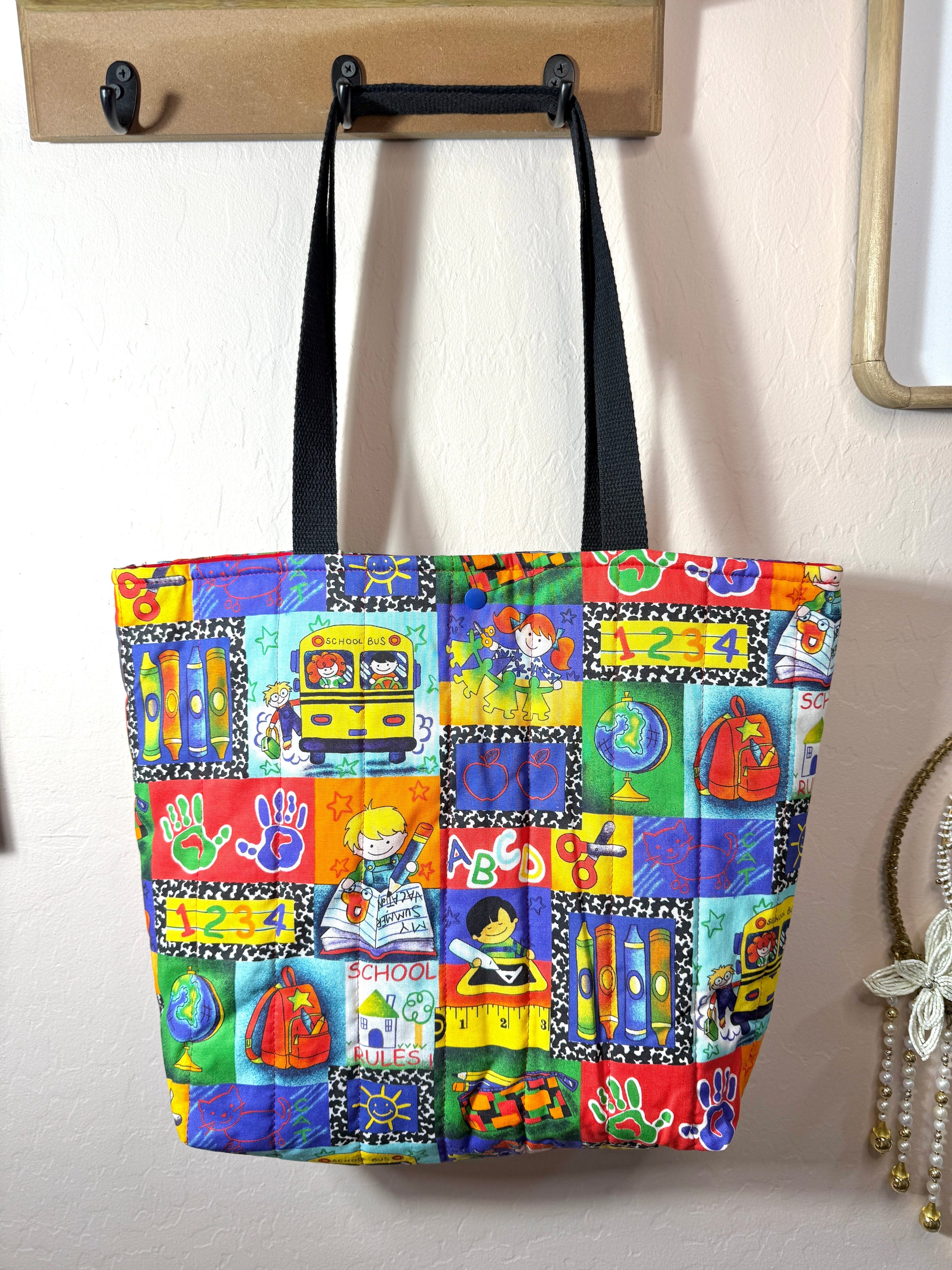 Carry your essentials in style with this handmade oversized tote featuring this fun teacher's school print. The black cotton webbing straps make it easy to sling over your shoulder, while the secure plastic snap closure keeps your belongings safe. Inside, you'll discover a cheerful red lining and two large convenient pockets perfect for organizing everything from your phone to your keys. Exterior features 1 pocket. Whether you're heading to school or work, this playful tote brings a touch of charm to everyday life. Truly one of a kind!