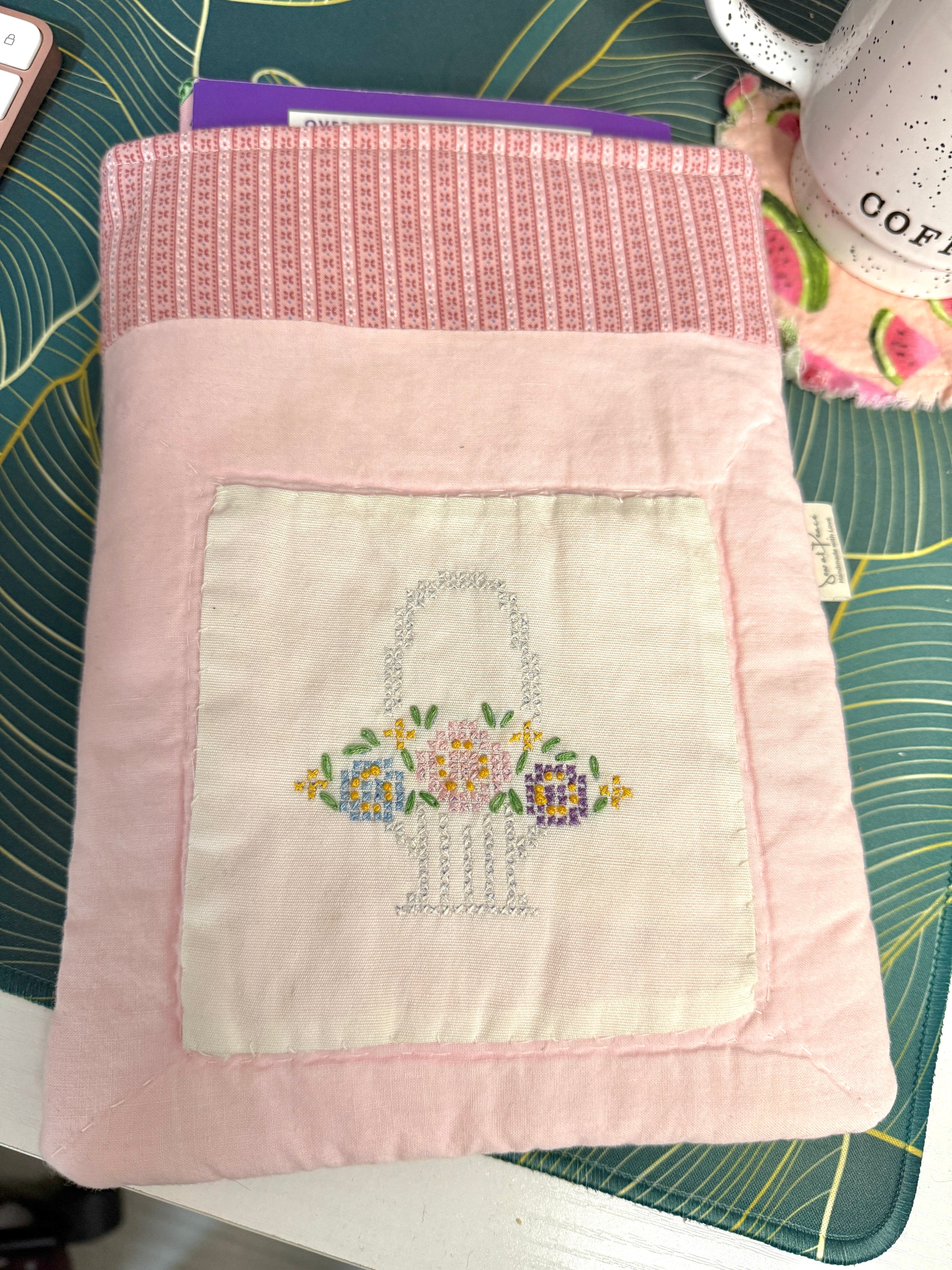 Upcycled Vintage Cross-Stitched Quilt Book Sleeve - Pink Lining