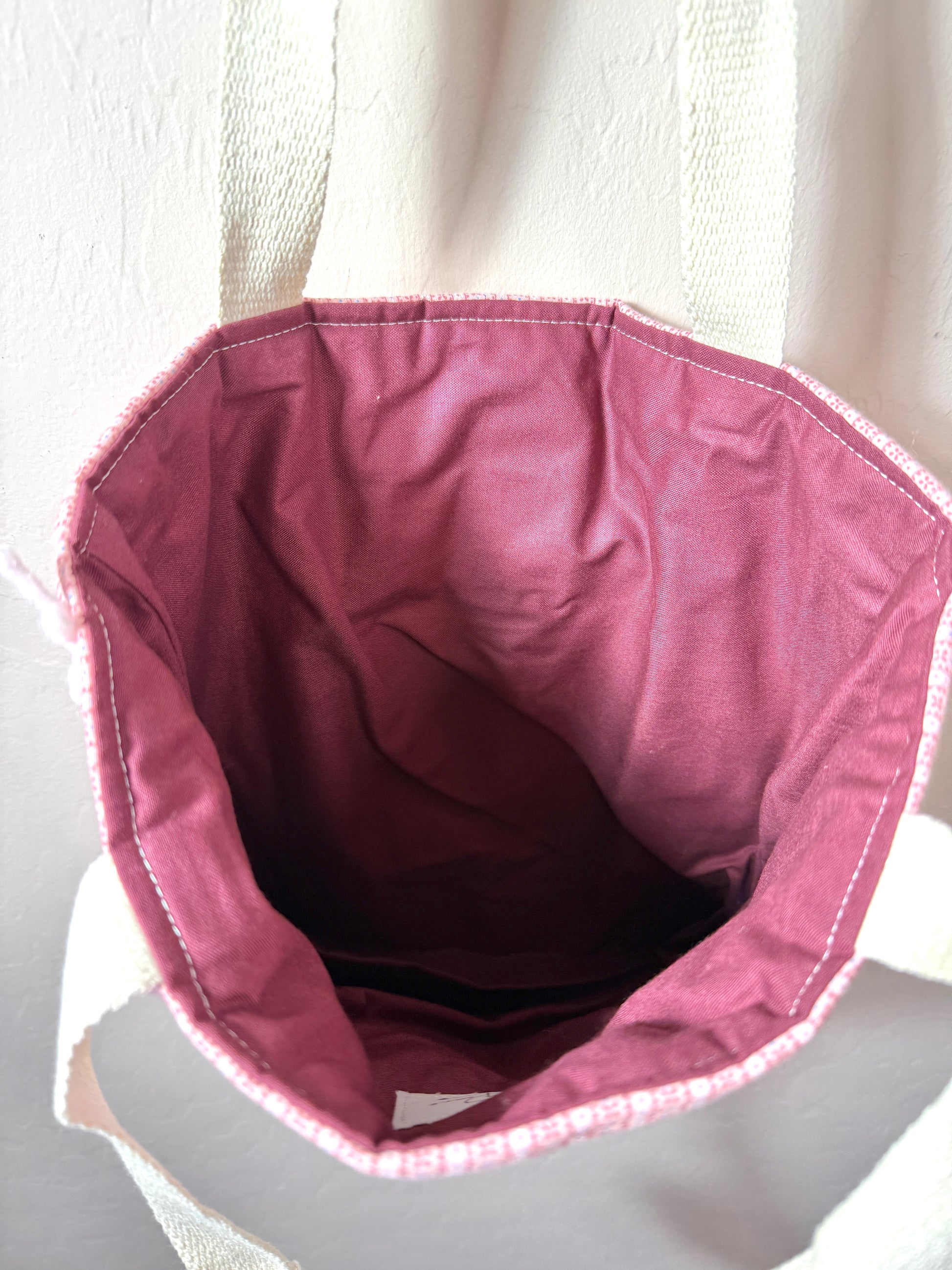 This charming, one of a kind tote blends vintage nostalgia with modern practicality! Built around an authentic 1950s handmade quilt, each side showcases its own delightful cross-stitched floral bouquet. The front and back displays that gorgeous vintage patina—complete with natural dimpling that proves its decades of love. Lined in new cabernet colored fabric with no pockets or closure. This bag has personality for days. Sturdy cotton webbing straps and original yarn ties make it as durable as it is delightful. Ideal for the eco-minded collector who values both sophistication and sustainability.
