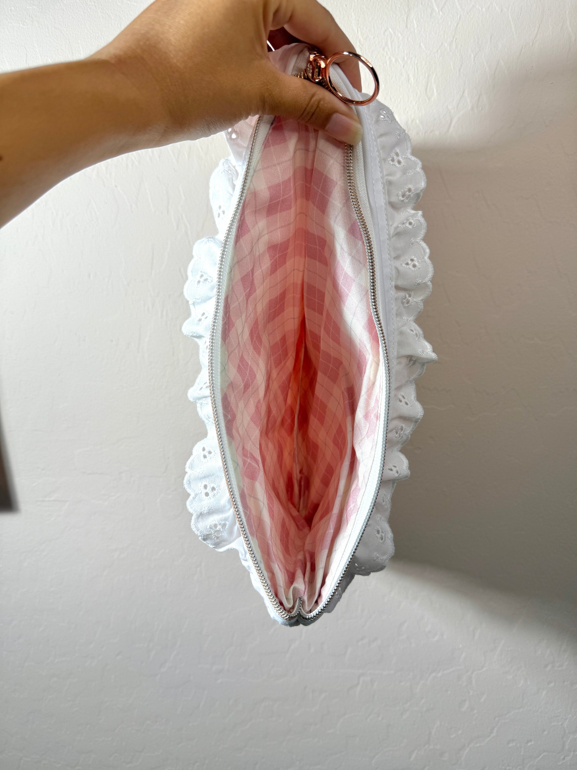 Keep your stuff organized with serious style in this one-of-a-kind handmade upcycled pouch. We've paired vintage cross-stitched quilt fabric with a shiny rose gold zipper and matching ring pull for easy access. The delicate white eyelet lace trim adds a sweet vintage vibe, while the new pink plaid lining peeks out to surprise you every time you open it. Eco-friendly, quirky, and totally unique—because your accessories deserve to be as special as you are. Great for storing toiletries, craft supplies, or use as a clutch purse and much more!