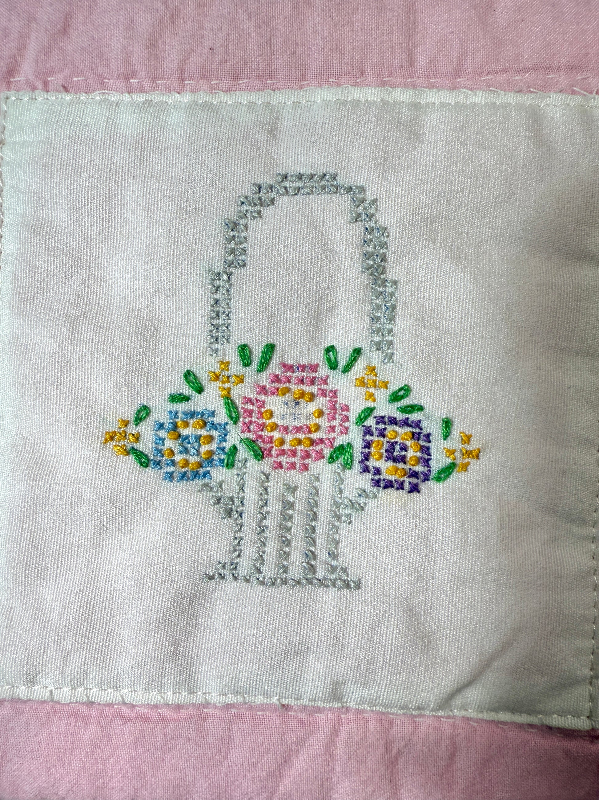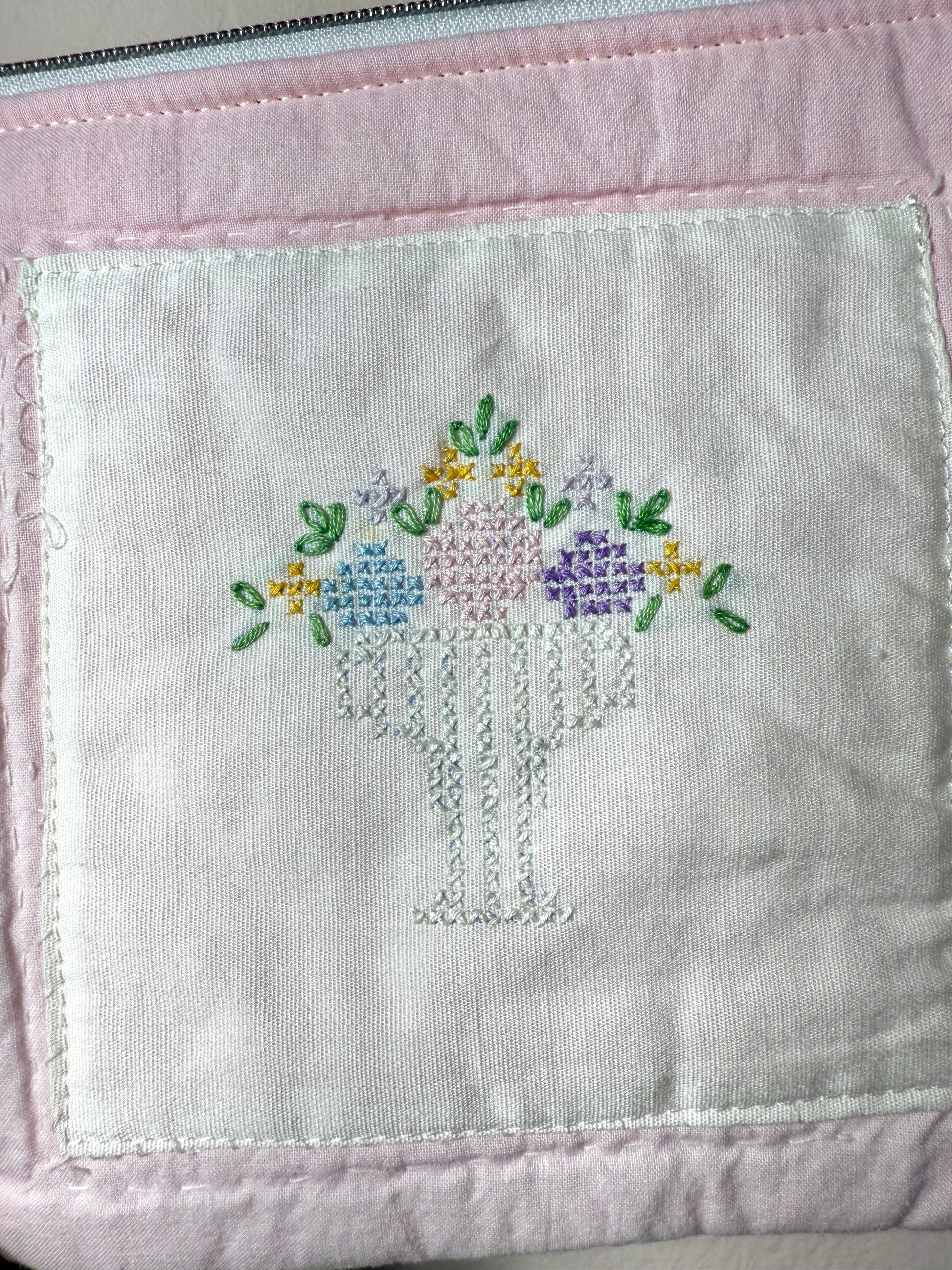 Upcycled Vintage Cross-Stitched Quilt Zipper Pouch-Rose zip