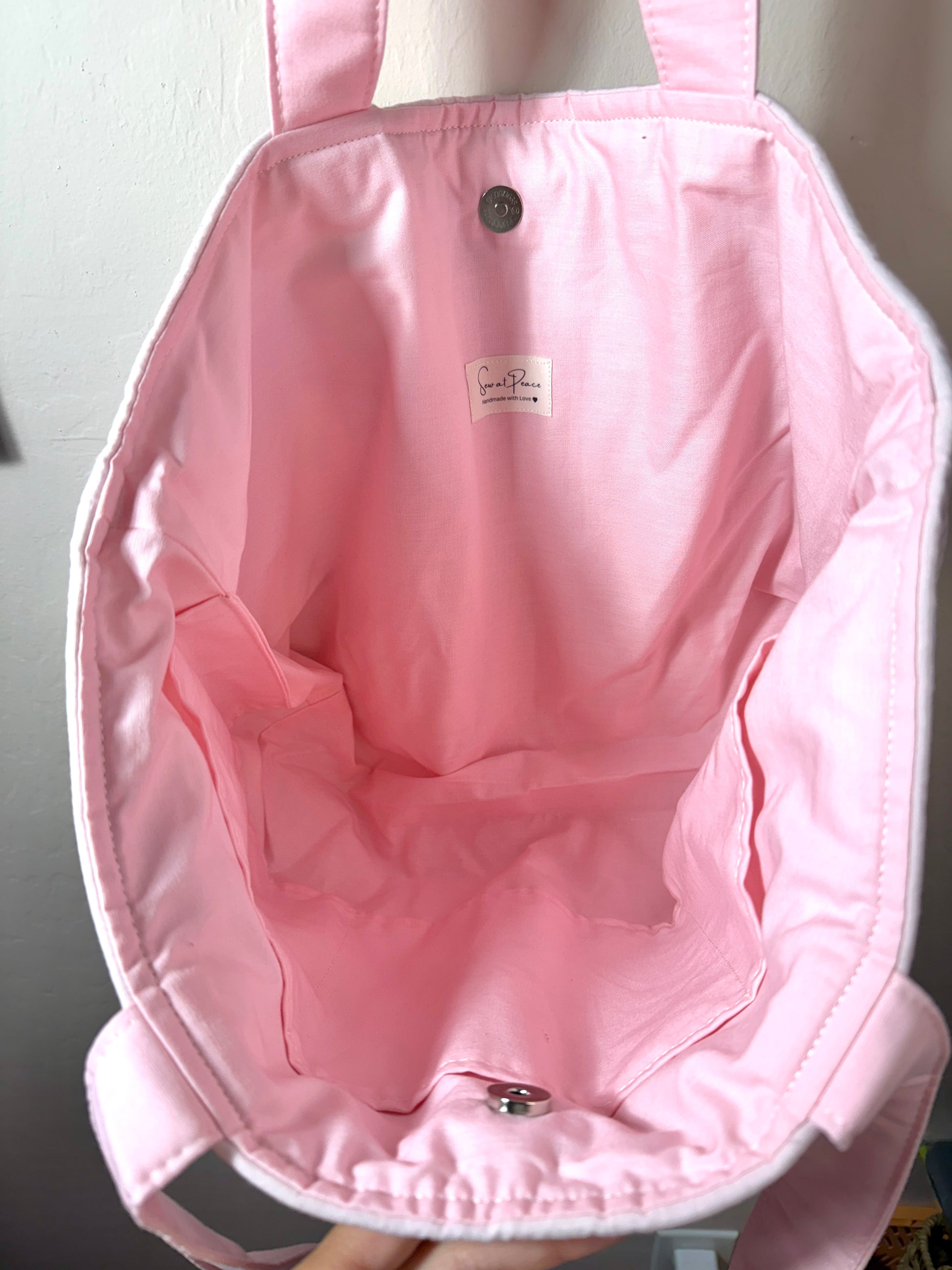 This charming, one of a kind tote blends vintage nostalgia with modern practicality! Constructed from a handmade vintage patchwork pillowcase from the 1950s. Lined in new soft pink fabric with three interior pockets and a secure metal snap, this bag has personality for days. Sturdy pink straps make it as durable as it is delightful. Ideal for the eco-minded collector who values both sophistication and sustainability.